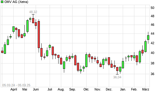 Mit dem Anstieg auf 43,38 EUR hat die OMV-Aktie (ISIN AT0000743059) am 04.03.2025 ein neues 6-Monats-Hoch erreicht und damit den Kurs vom 26.02.2025 eingestellt.