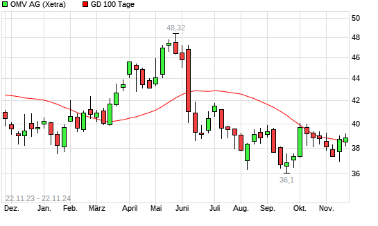 Mit dem Anstieg auf 39,08 EUR hat die OMV-Aktie am 21.11.2024 die 100-Tage-Linie nach oben gekreuzt.
