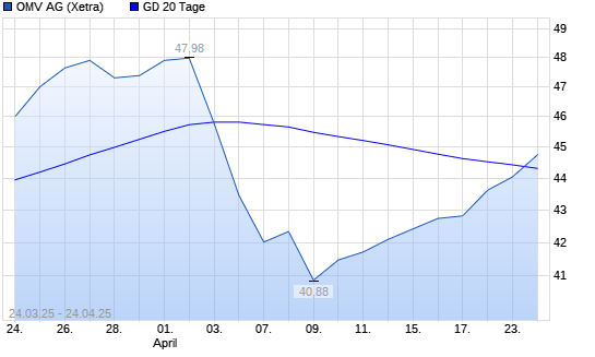 Mit dem Anstieg auf 44,40 EUR hat die OMV-Aktie am 23.04.2025 die 20-Tage-Linie nach oben gekreuzt.