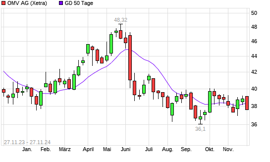 Mit dem Rücksetzer auf 38,12 EUR hat die OMV-Aktie am 26.11.2024 die 50-Tage-Linie nach unten gekreuzt.