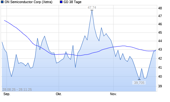 Mit dem Rücksetzer auf 42,57 EUR hat die ON Semiconductor-Aktie am 27.11.2025 die 38-Tage-Linie nach unten gekreuzt.