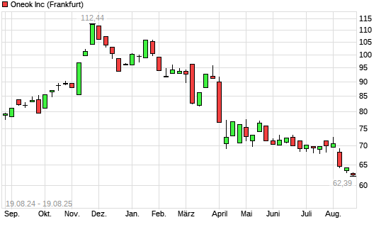 Mit dem Rücksetzer auf 63,02 EUR hat die ONEOK-Aktie (ISIN US6826801036) am 18.08.2025 ein neues 12-Monats-Tief erreicht und damit den Kurs vom 13.08.2025 eingestellt.