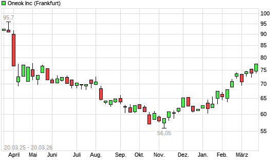 Mit dem Anstieg auf 77,02 EUR hat die ONEOK-Aktie (ISIN US6826801036) am 19.03.2026 ein neues 6-Monats-Hoch erreicht und damit den Kurs vom 17.03.2026 eingestellt.