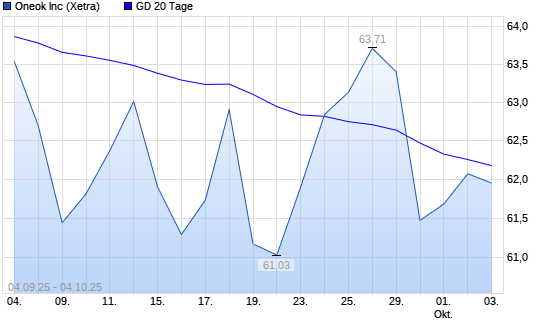 Mit dem Rücksetzer auf 61,76 EUR hat die ONEOK-Aktie am 03.10.2025 die 20-Tage-Linie nach unten gekreuzt.