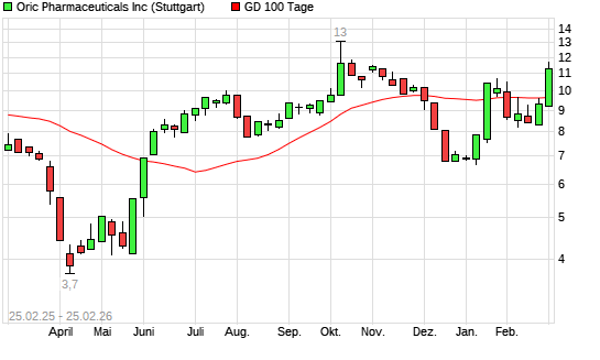 Mit dem Anstieg auf 10,30 EUR hat die ORIC PHARMAC.-Aktie am 24.02.2026 die 100-Tage-Linie nach oben gekreuzt.