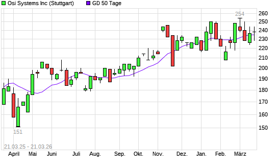 Mit dem Anstieg auf 236,00 EUR hat die OSI SYSTEMS-Aktie am 20.03.2026 die 50-Tage-Linie nach oben gekreuzt.