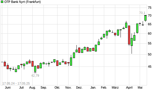 Mit dem Anstieg auf 70,10 EUR hat die OTP Bank-Aktie (ISIN HU0000061726) am 16.05.2025 ein neues All-Time-High erreicht und damit den Kurs vom 15.05.2025 eingestellt.