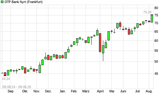 Mit dem Anstieg auf 75,28 EUR hat die OTP Bank-Aktie (ISIN HU0000061726) am 08.08.2025 ein neues All-Time-High erreicht und damit den Kurs vom 07.08.2025 eingestellt.