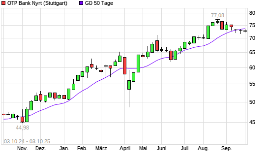 Mit dem Anstieg auf 74,94 EUR hat die OTP Bank-Aktie am 02.10.2025 die 50-Tage-Linie nach oben gekreuzt.