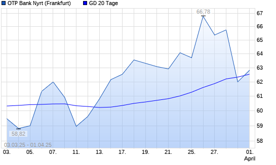 Mit dem Rücksetzer auf 62,00 EUR hat die OTP Bank-Aktie am 31.03.2025 die 20-Tage-Linie nach unten gekreuzt.