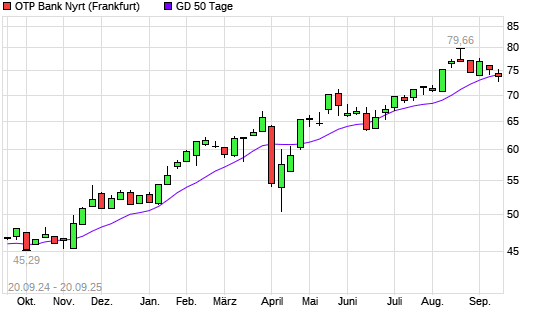 Mit dem Rücksetzer auf 73,82 EUR hat die OTP Bank-Aktie am 19.09.2025 die 50-Tage-Linie nach unten gekreuzt.