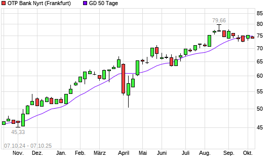 Mit dem Rücksetzer auf 74,88 EUR hat die OTP Bank-Aktie am 06.10.2025 die 50-Tage-Linie nach unten gekreuzt.