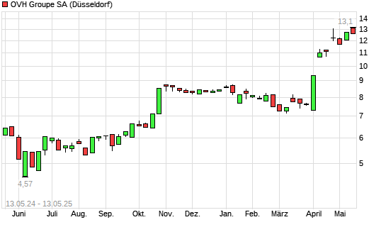 Mit dem Anstieg auf 13,02 EUR hat die OVH Groupe-Aktie (ISIN FR0014005HJ9) am 12.05.2025 ein neues 12-Monats-Hoch erreicht und damit den Kurs vom 09.05.2025 eingestellt.