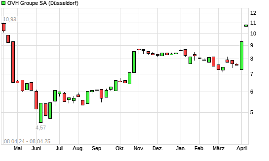 Mit dem Anstieg auf 10,40 EUR hat die OVH Groupe-Aktie (ISIN FR0014005HJ9) am 07.04.2025 ein neues 6-Monats-Hoch erreicht und damit den Kurs vom 03.04.2025 eingestellt.
