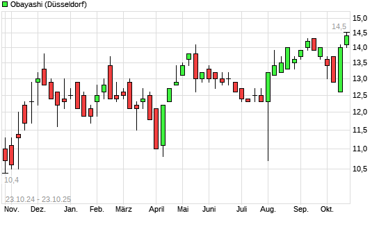 Mit dem Anstieg auf 14,50 EUR hat die Obayashi-Aktie (ISIN JP3190000004) am 22.10.2025 ein neues All-Time-High erreicht und damit den Kurs vom 09.09.2025 eingestellt.