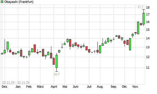 Mit dem Anstieg auf 17,20 EUR hat die Obayashi-Aktie (ISIN JP3190000004) am 21.11.2025 ein neues All-Time-High erreicht und damit den Kurs vom 19.11.2025 eingestellt.
