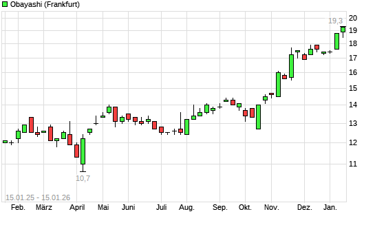 Mit dem Anstieg auf 19,10 EUR hat die Obayashi-Aktie (ISIN JP3190000004) am 14.01.2026 ein neues All-Time-High erreicht und damit den Kurs vom 12.01.2026 eingestellt.