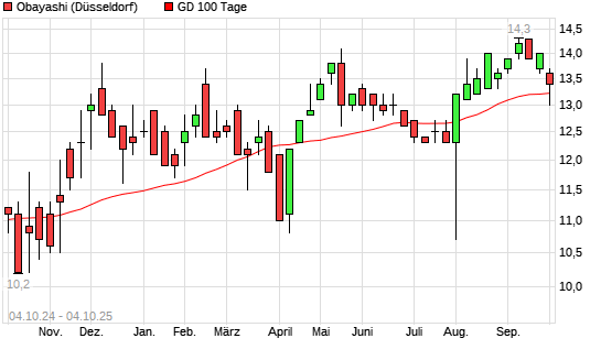 Mit dem Anstieg auf 13,40 EUR hat die Obayashi-Aktie am 03.10.2025 die 100-Tage-Linie nach oben gekreuzt.