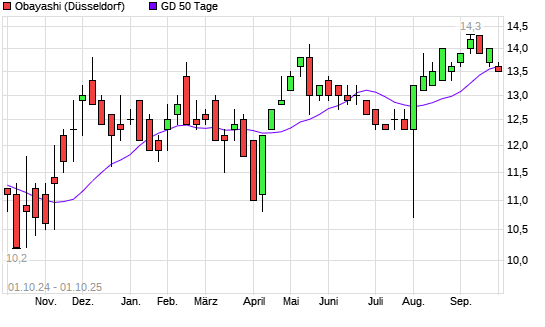 Mit dem Anstieg auf 13,80 EUR hat die Obayashi-Aktie am 30.09.2025 die 50-Tage-Linie nach oben gekreuzt.