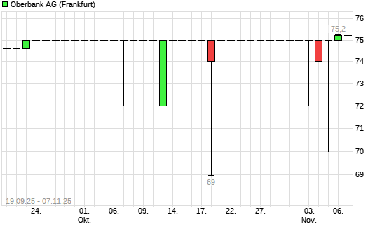Mit dem Anstieg auf 75,20 EUR hat die Oberbank-Aktie (ISIN AT0000625108) am 06.11.2025 ein neues 12-Monats-Hoch erreicht und damit den Kurs vom 05.11.2025 eingestellt.
