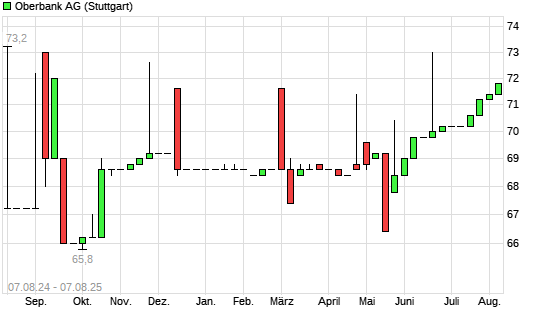 Mit dem Anstieg auf 71,80 EUR hat die Oberbank-Aktie (ISIN AT0000625108) am 06.08.2025 ein neues 6-Monats-Hoch erreicht und damit den Kurs vom 04.08.2025 eingestellt.