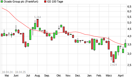 Mit dem Anstieg auf 3,80 EUR hat die Ocado Group-Aktie am 15.04.2025 die 100-Tage-Linie nach oben gekreuzt.