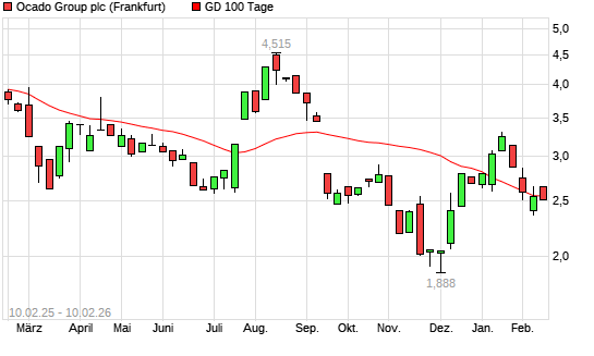 Mit dem Anstieg auf 2,65 EUR hat die Ocado Group-Aktie am 09.02.2026 die 100-Tage-Linie nach oben gekreuzt.