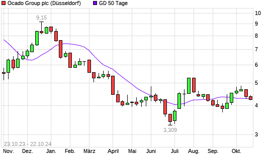 Mit dem Anstieg auf 4,37 EUR hat die Ocado Group-Aktie am 21.10.2024 die 50-Tage-Linie nach oben gekreuzt.