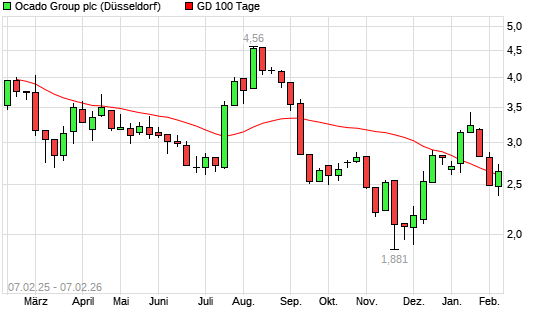 Mit dem Rücksetzer auf 2,55 EUR hat die Ocado Group-Aktie am 06.02.2026 die 100-Tage-Linie nach unten gekreuzt.