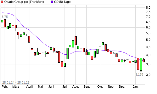 Mit dem Rücksetzer auf 3,61 EUR hat die Ocado Group-Aktie am 24.01.2025 die 50-Tage-Linie nach unten gekreuzt.
