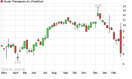 Mit dem Rücksetzer auf 5,78 EUR hat die Ocular Therapeutix-Aktie (ISIN US67576A1007) am 19.02.2026 ein neues 6-Monats-Tief erreicht und damit den Kurs vom 17.02.2026 eingestellt.