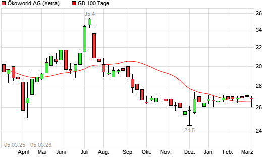 Mit dem Rücksetzer auf 26,20 EUR hat die Ökoworld-Aktie am 04.03.2026 die 100-Tage-Linie nach unten gekreuzt.