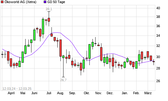 Mit dem Rücksetzer auf 28,60 EUR hat die Ökoworld-Aktie am 11.03.2025 die 50-Tage-Linie nach unten gekreuzt.