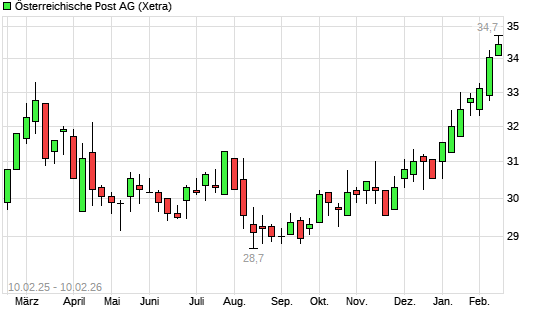Mit dem Anstieg auf 34,05 EUR hat die Österreichische Post-Aktie (ISIN AT0000APOST4) am 09.02.2026 ein neues 12-Monats-Hoch erreicht und damit den Kurs vom 05.02.2026 eingestellt.