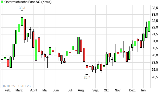 Mit dem Anstieg auf 32,60 EUR hat die Österreichische Post-Aktie (ISIN AT0000APOST4) am 15.01.2026 ein neues 6-Monats-Hoch erreicht und damit den Kurs vom 12.01.2026 eingestellt.