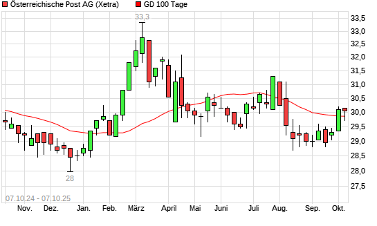 Mit dem Anstieg auf 29,95 EUR hat die Österreichische Post-Aktie am 06.10.2025 die 100-Tage-Linie nach oben gekreuzt.