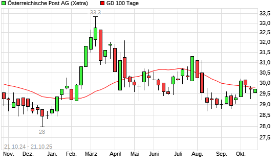 Mit dem Anstieg auf 29,90 EUR hat die Österreichische Post-Aktie am 20.10.2025 die 100-Tage-Linie nach oben gekreuzt.
