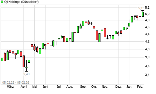 Mit dem Anstieg auf 5,10 EUR hat die Oji Holdings-Aktie (ISIN JP3174410005) am 04.02.2026 ein neues 3-Jahres-Hoch erreicht und damit den Kurs vom 03.02.2026 eingestellt.