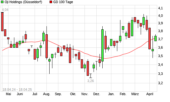 Mit dem Rücksetzer auf 3,74 EUR hat die Oji Holdings-Aktie am 17.04.2025 die 100-Tage-Linie nach unten gekreuzt.