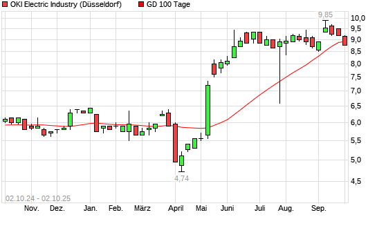 Mit dem Rücksetzer auf 8,85 EUR hat die Oki Electric Industry-Aktie am 01.10.2025 die 100-Tage-Linie nach unten gekreuzt.