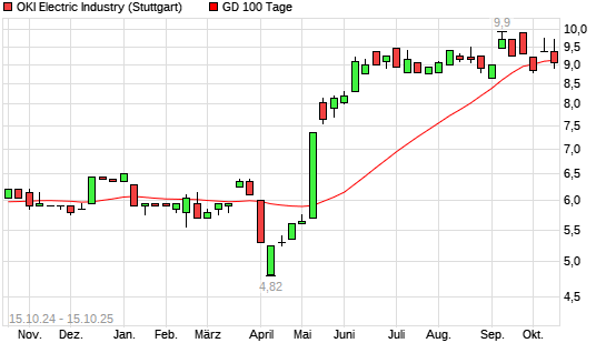 Mit dem Rücksetzer auf 8,90 EUR hat die Oki Electric Industry-Aktie am 14.10.2025 die 100-Tage-Linie nach unten gekreuzt.