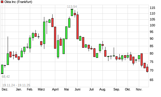 Mit dem Rücksetzer auf 69,56 EUR hat die Okta-Aktie (ISIN US6792951054) am 18.11.2025 ein neues 6-Monats-Tief erreicht und damit den Kurs vom 17.11.2025 eingestellt.