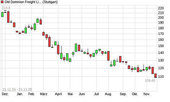 Mit dem Rücksetzer auf 110,55 EUR hat die Old Dominion Freight Line-Aktie (ISIN US6795801009) am 20.11.2025 ein neues 3-Jahres-Tief erreicht und damit den Kurs vom 18.11.2025 eingestellt.