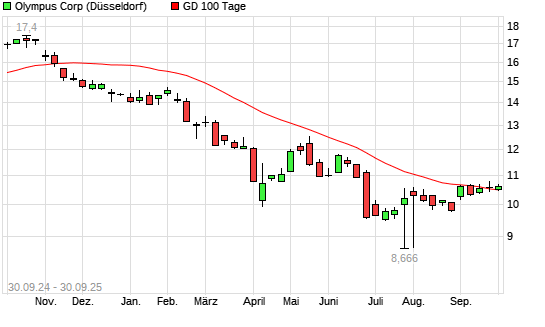 Mit dem Rücksetzer auf 10,49 EUR hat die Olympus-Aktie am 29.09.2025 die 100-Tage-Linie nach unten gekreuzt.
