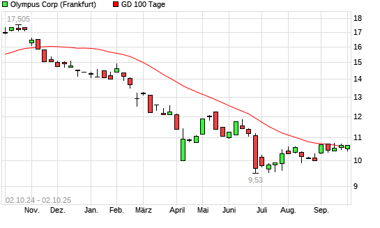 Mit dem Rücksetzer auf 10,43 EUR hat die Olympus-Aktie am 01.10.2025 die 100-Tage-Linie nach unten gekreuzt.