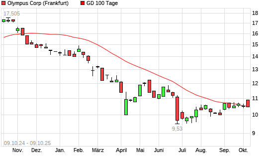 Mit dem Rücksetzer auf 10,53 EUR hat die Olympus-Aktie am 08.10.2025 die 100-Tage-Linie nach unten gekreuzt.