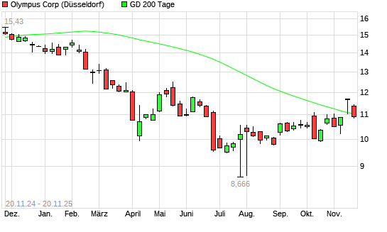 Mit dem Rücksetzer auf 11,02 EUR hat die Olympus-Aktie am 19.11.2025 die 200-Tage-Linie nach unten gekreuzt.