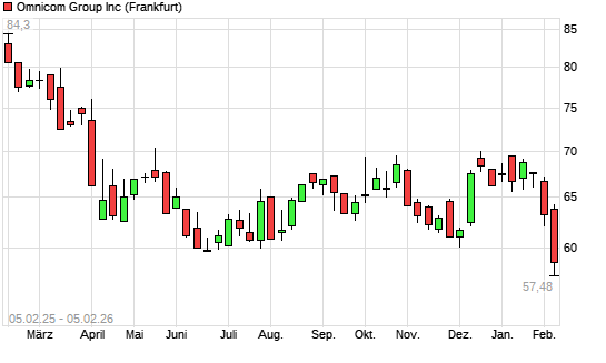 Mit dem Rücksetzer auf 57,48 EUR hat die Omnicom Group-Aktie (ISIN US6819191064) am 04.02.2026 ein neues 3-Jahres-Tief erreicht und damit den Kurs vom 20.06.2025 eingestellt.