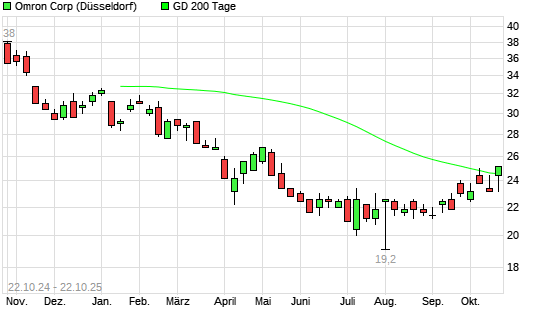Mit dem Anstieg auf 25,00 EUR hat die Omron-Aktie am 21.10.2025 die 200-Tage-Linie nach oben gekreuzt.