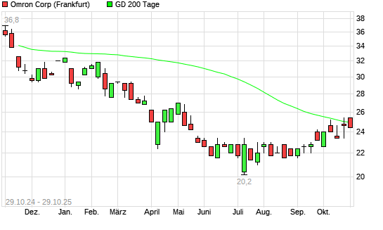 Mit dem Rücksetzer auf 24,40 EUR hat die Omron-Aktie am 28.10.2025 die 200-Tage-Linie nach unten gekreuzt.